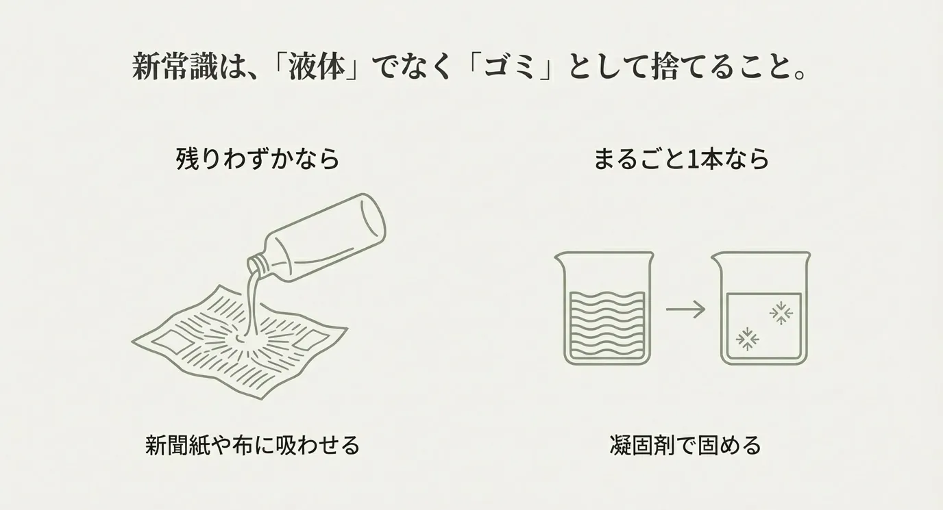 処分したい量がボトル1本分以上ある場合には、この凝固剤を活用した方法が最もスマートで確実な手段となります。