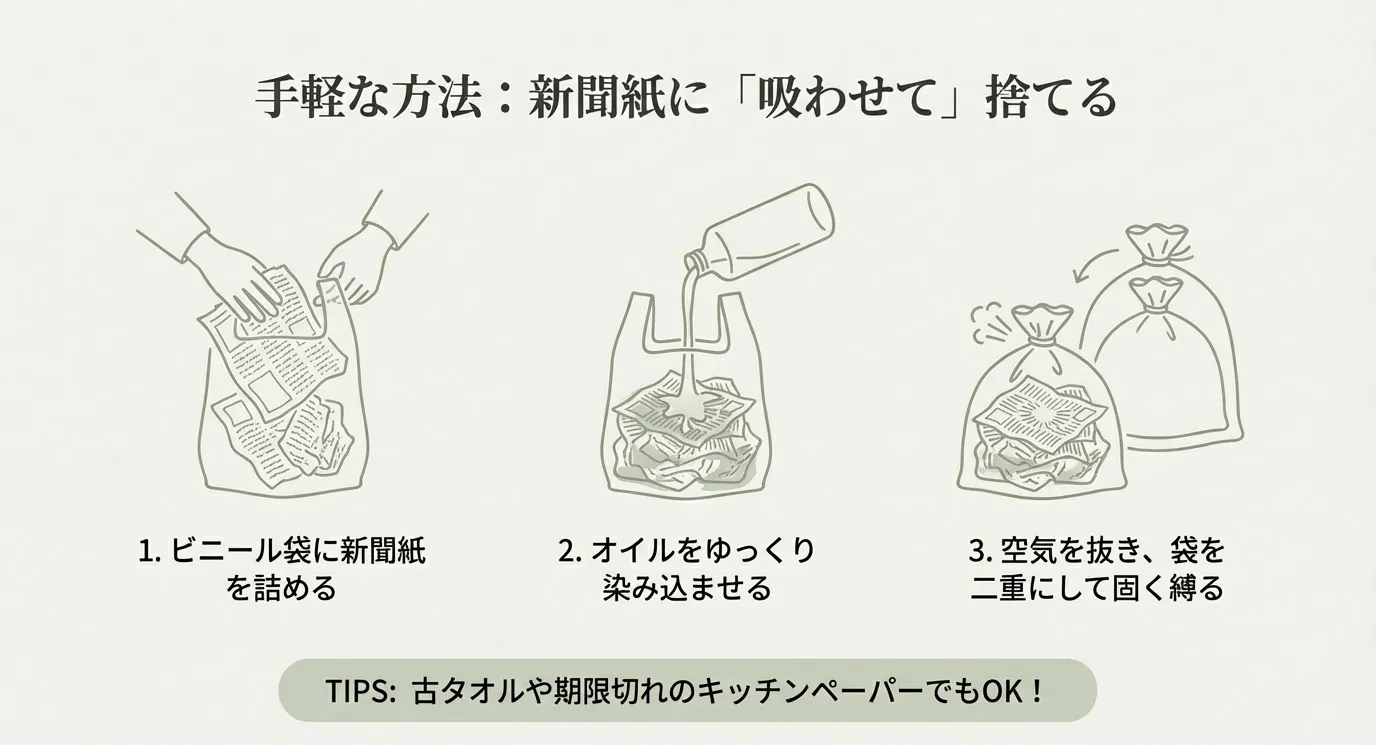 最も一般的で手軽な処分方法は、新聞紙や古くなった布にオイルを吸わせて可燃ゴミとして出す方法です。準備するものは、ビニール袋(できれば二重にする)、新聞紙または使い古したTシャツなどの布、ガムテープです。