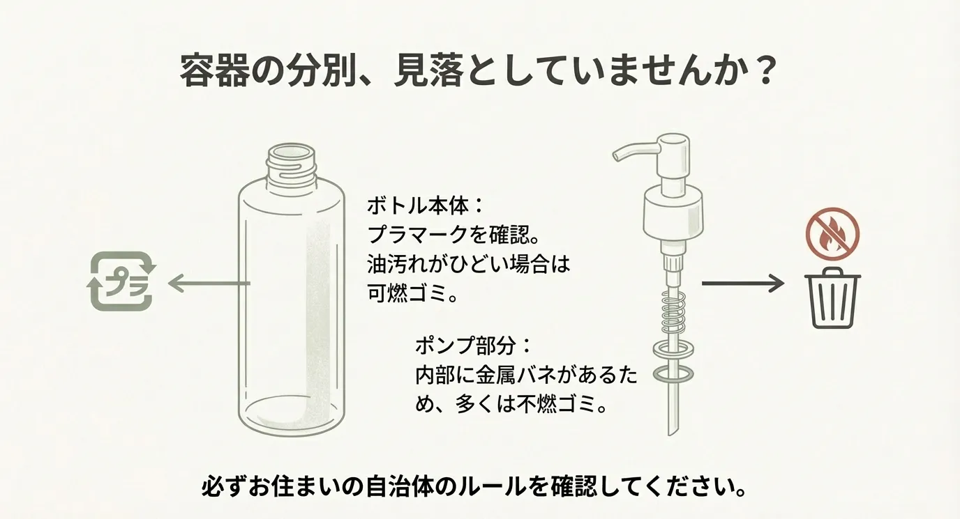 • ポンプ:内部に金属バネがあるため、不燃ゴミ扱いが一般的。