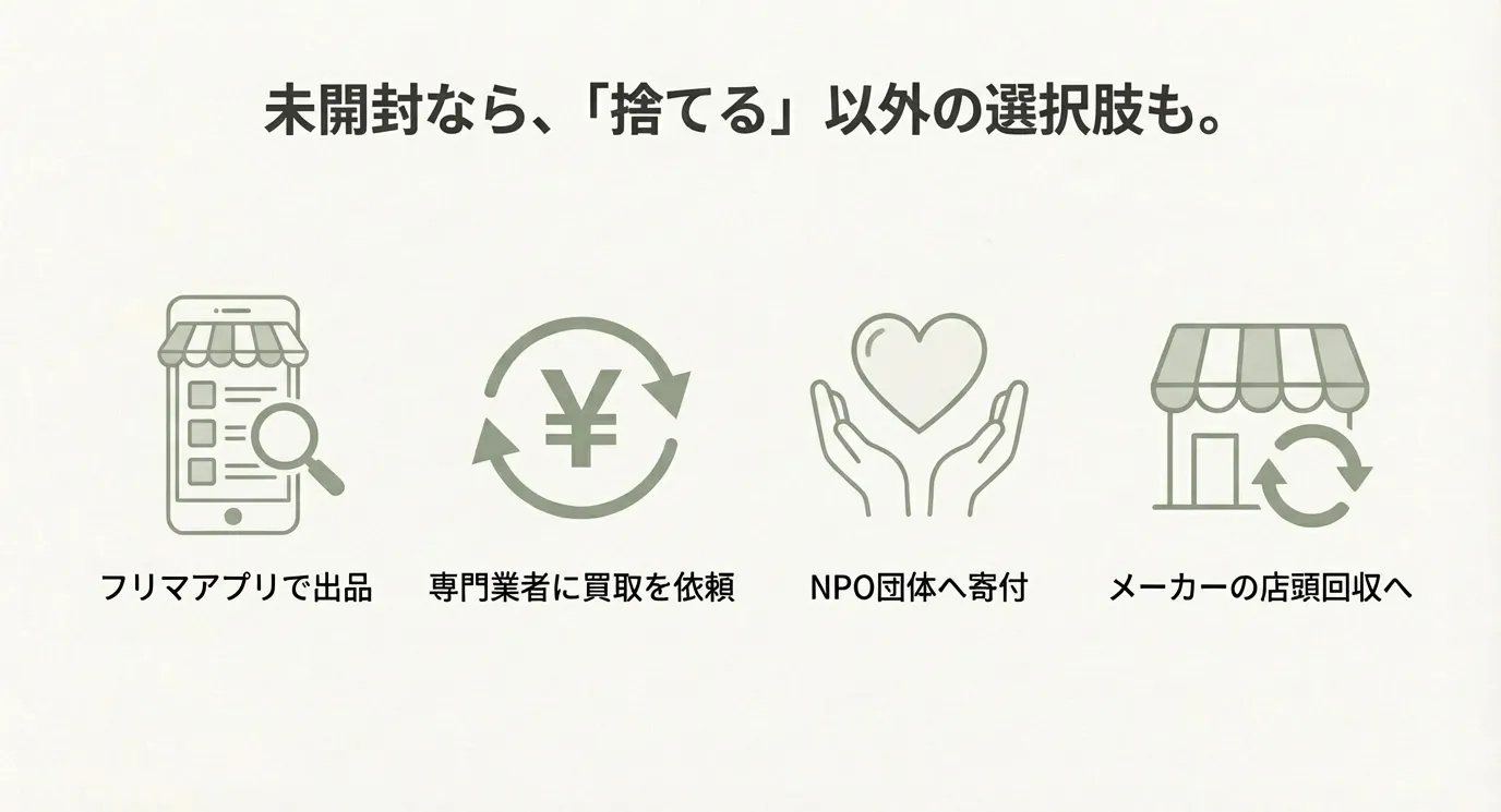 • 使用期限の目安を知り、未開封品なら寄付や買取を検討することで罪悪感を減らせる