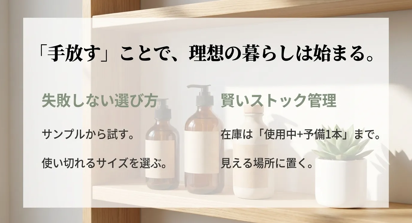 毎日の使用量を計算し、3ヶ月から半年で無理なく使い切れる容量のボトルを選べば、鮮度の高い状態で使い切る達成感を味わえます。流行や安さに惑わされず、「今の自分に本当に必要な分だけ」を手に入れる習慣をつけることが、結果的に無駄なゴミを出さない、持続可能な美容ライフへと繋がります。