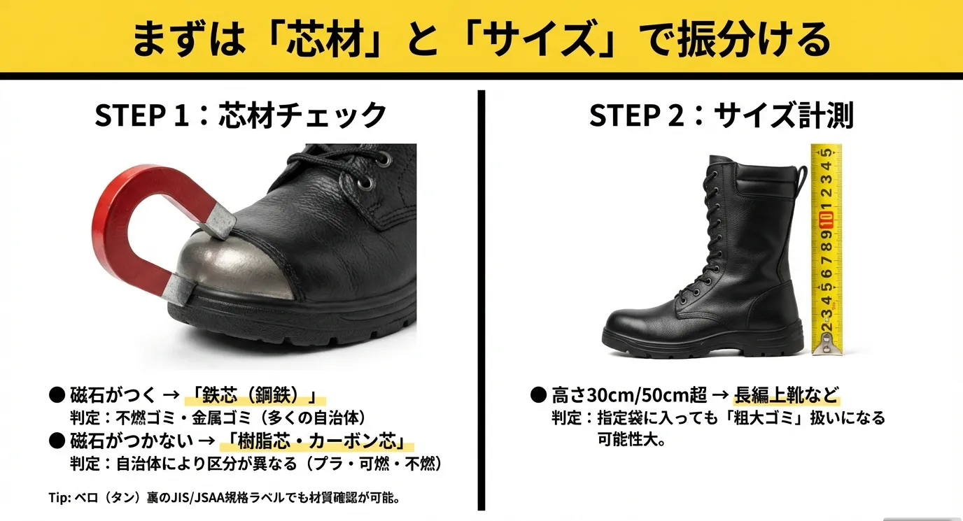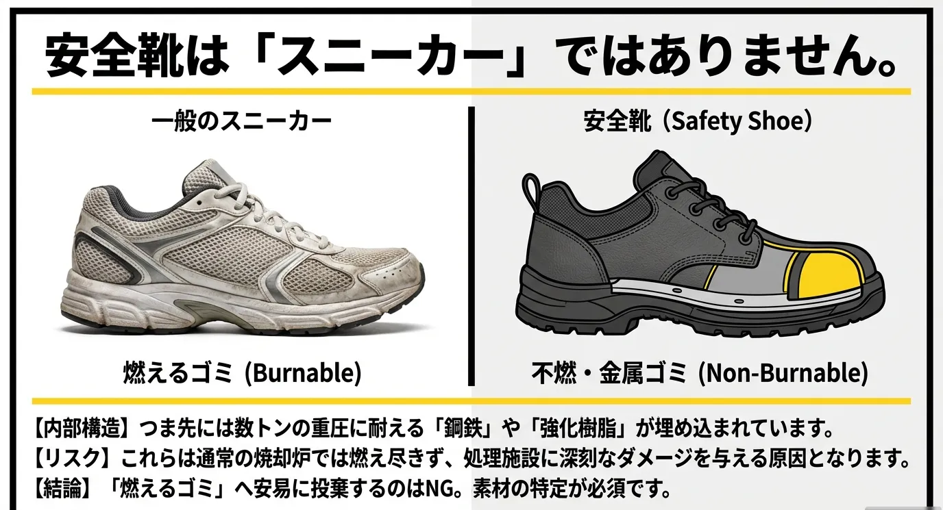 安全靴にはつま先を保護するための非常に硬い芯材が入っており、これが「燃えないゴミ(不燃ゴミ)」か「金属ゴミ」かの判断を分ける大きな要因となります。