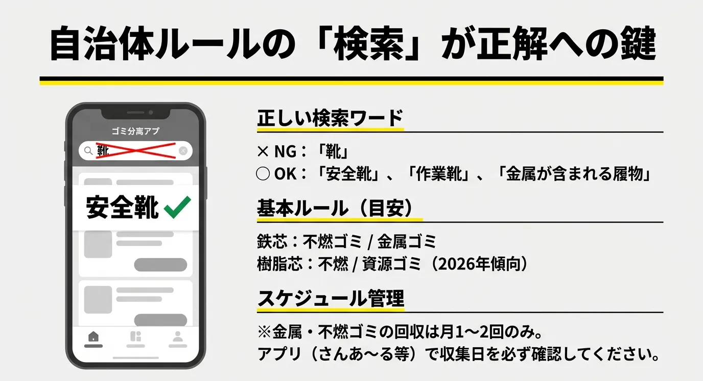 - 安全靴を捨てる際は、まず自治体の公式ウェブサイトやアプリで最新ルールを確認する