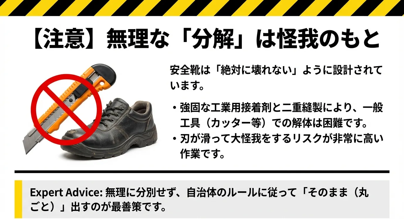 「素材ごとに完璧に分別して捨てたい」という高い環境意識をお持ちの方や、自治体のルールで芯材の取り出しを推奨されている場合、ご自身で安全靴を解体するという選択肢があります。