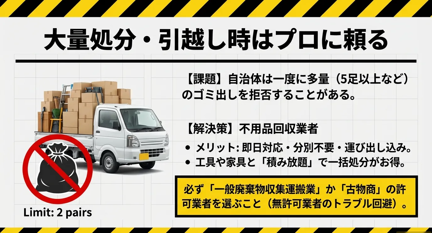 - 家庭から出す場合は、一度に2足程度に留めるか、自治体の粗大ゴミ受付センターに事前に相談しましょう。