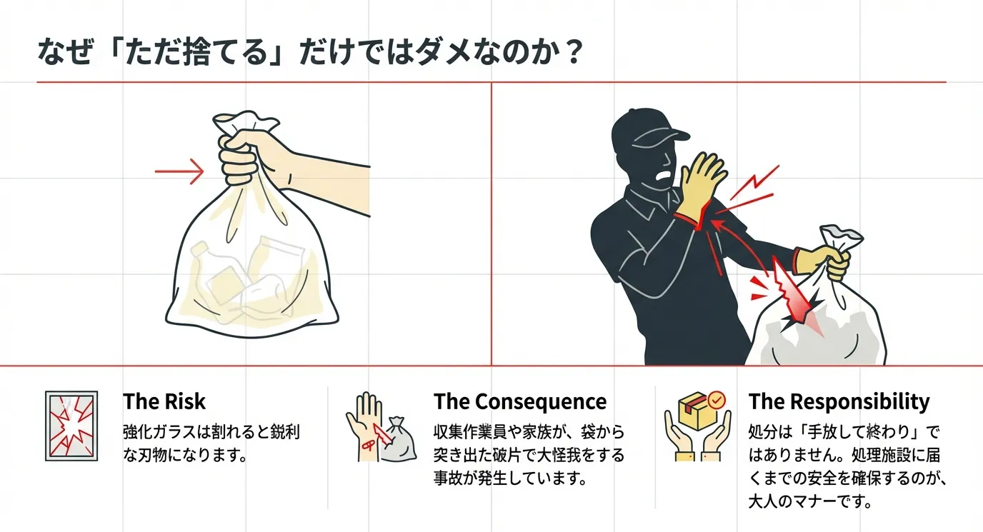 ガラスフィルムを捨てる際に最も配慮すべきは、ゴミを収集してくれる作業員の方々の安全です。強化ガラス製のフィルムは、割れると非常に鋭利な破片となります。最近の製品は飛散防止加工が施されているためバラバラにはなりにくいですが、それでも縁の部分から目に見えない細かなガラス粉が落ちるリスクがあります。そのため、ただ袋に入れるのではなく、徹底した安全梱包が必要です。