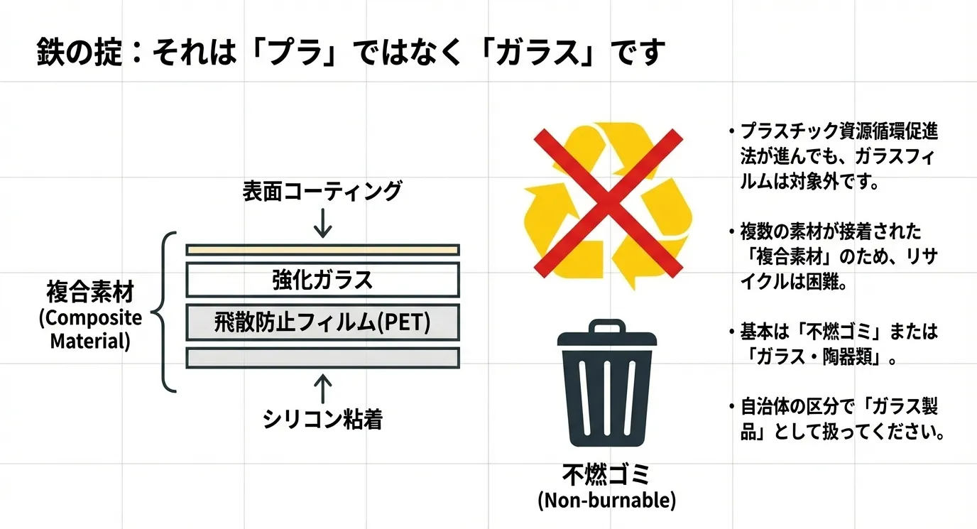 最近は「脱プラスチック」の流れで分別が複雑化していますが、ガラスフィルムは表面にシリコンやプラスチック層がある「複合素材」であるため、資源ゴミ(プラスチック資源)として出すことはできません。