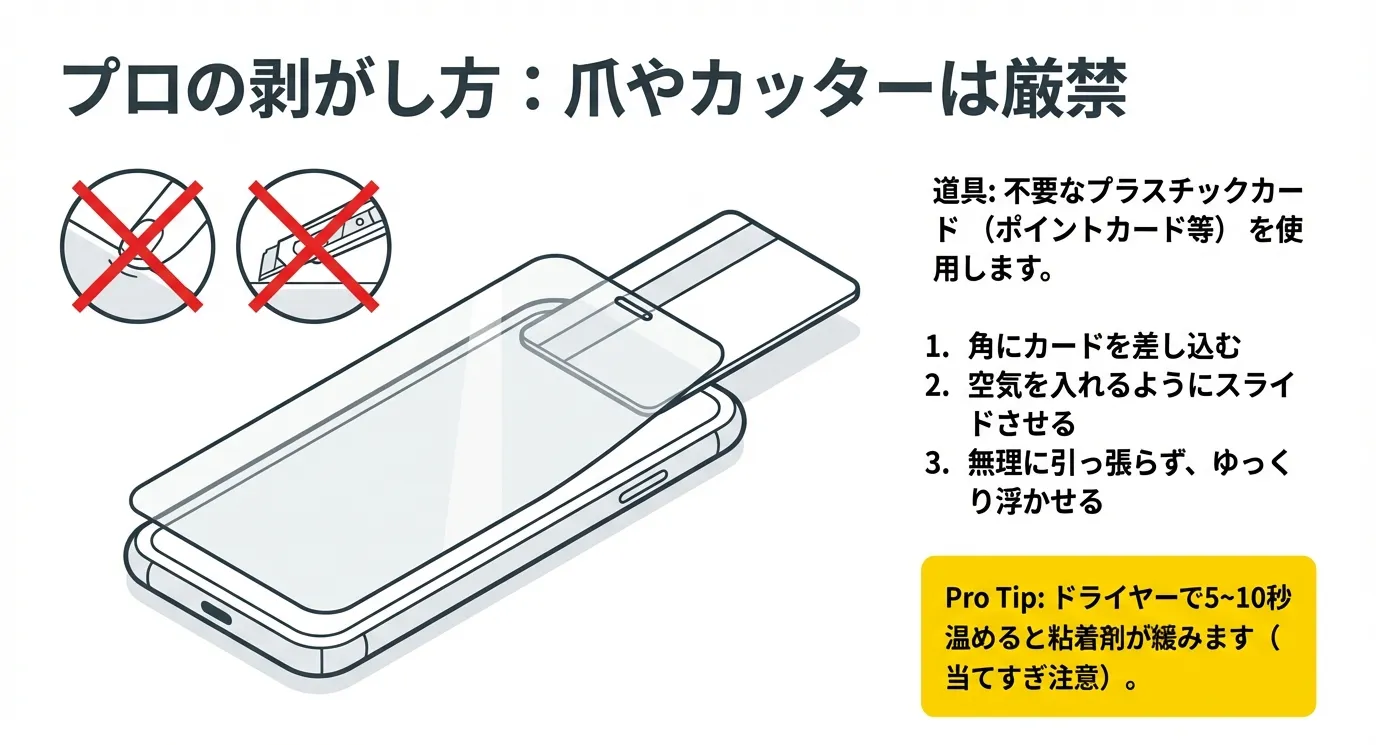ガラスフィルムを捨てる前段階として、スマホ本体から剥がす作業は慎重に行う必要があります。特にヒビが入った状態のフィルムを無理に剥がそうとすると、破片が飛び散ったり、スマホの液晶画面自体を傷つけてしまったりする恐れがあります。安全かつスムーズに剥がすためには、力任せに引っ張るのではなく、「物理的な隙間」をゆっくり広げていくことがコツです。