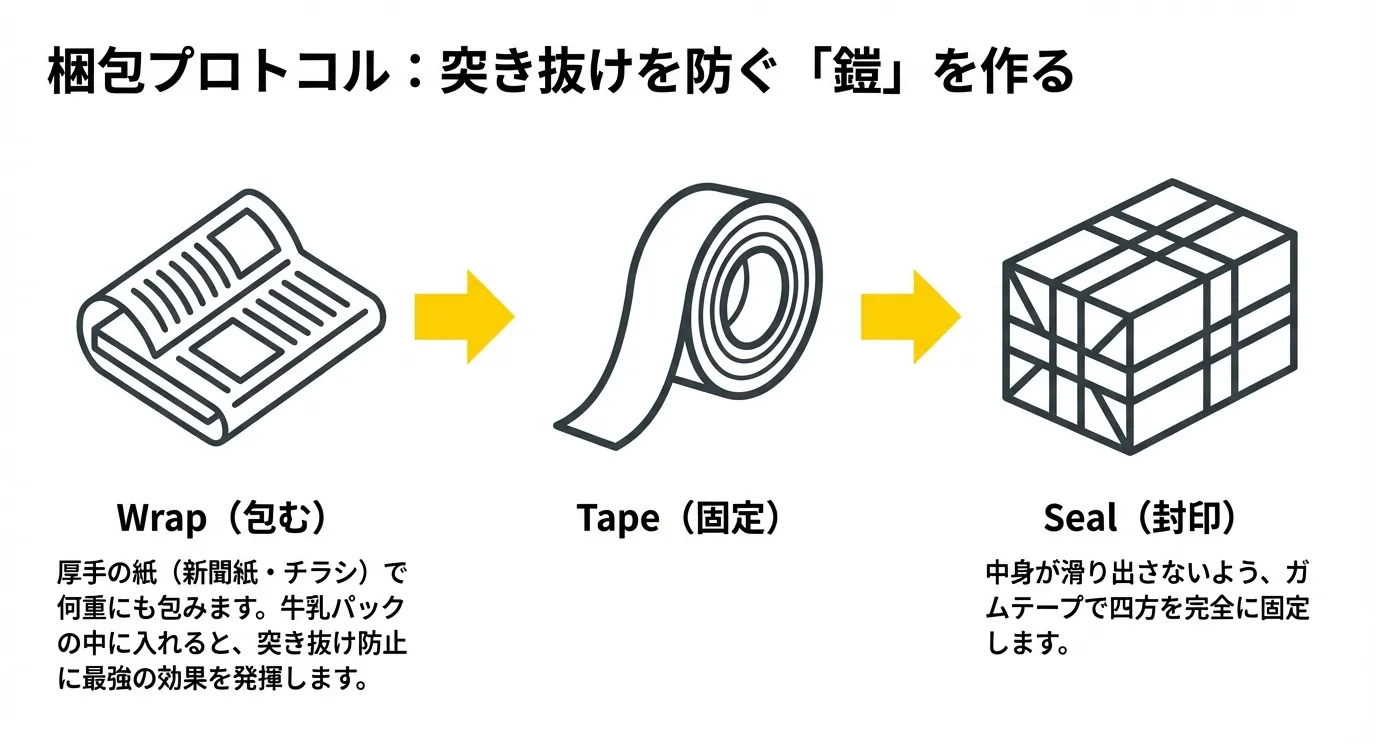 - ガムテープで封じる: 中身が滑り出さないよう、四方をしっかり固定します。