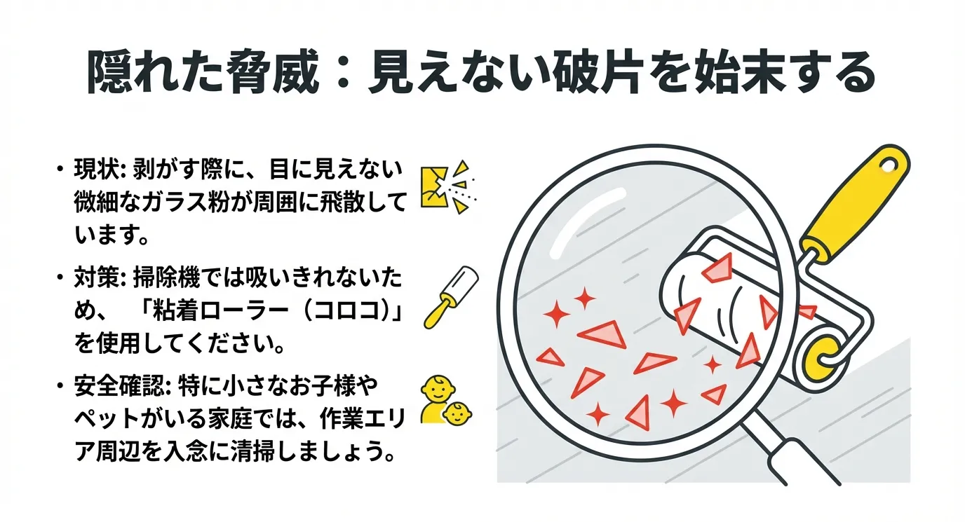 また、意外と見落としがちなのが「ペットや小さなお子様がいる環境での作業」です。床に落ちた微細なガラス片は、掃除機でも吸い取りきれないことがあり、後から家族が足の裏を切ってしまうなどの家庭内事故に繋がります。