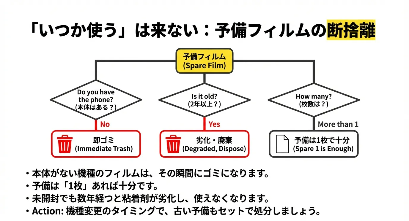 - 機種変更後の古い予備フィルムは活用の機会がないため即座に処分する