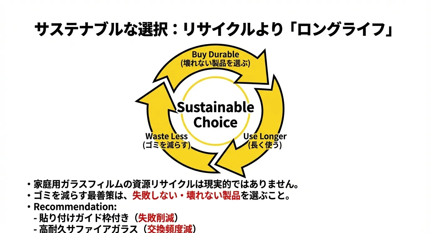最後に、これからガラスフィルムを選び、使っていく上でのサステナブルな視点についてお話しします。処分が難しいガラス製品だからこそ、私たちは「出口」だけでなく「入り口」にも意識を向ける必要があります。