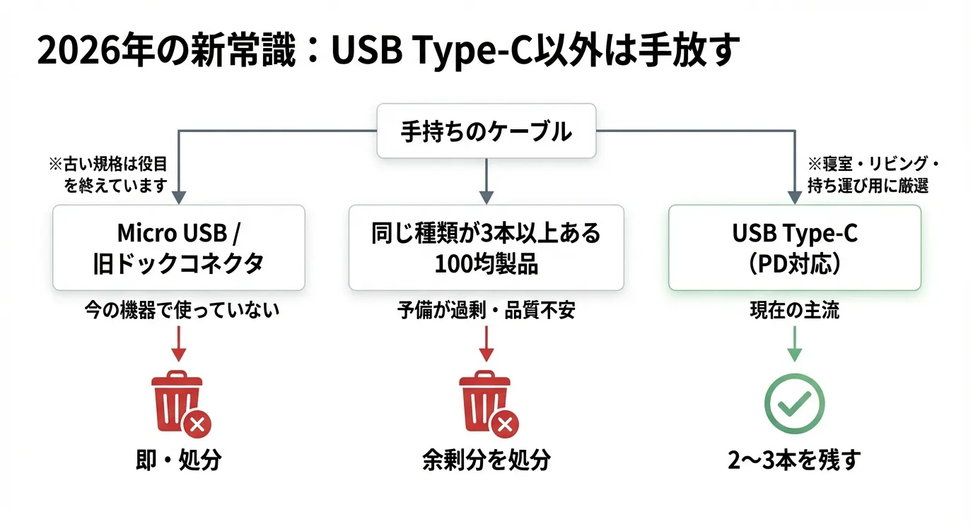 2026年の基準:欧州での共通充電器規制やApple製品の移行完了により、USB Type-Cが絶対的な主流です。Micro USBが必要な旧式機器も減っているため、思い切った処分が推奨されます。