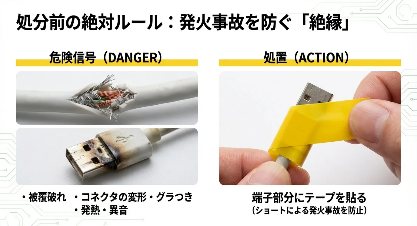 - 断線や異常発熱があるケーブルは火災の危険があるため即座に処分する