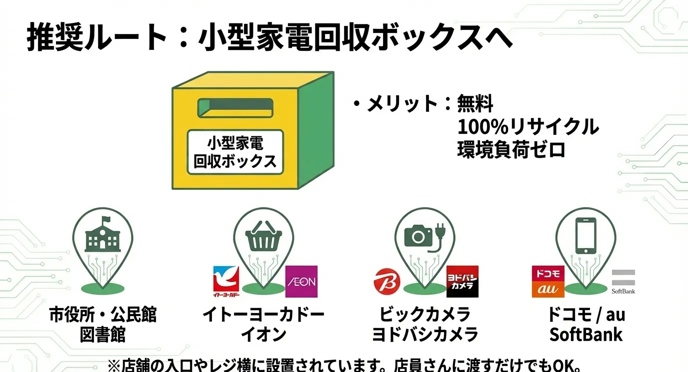 - 地域の公共施設やスーパーにある小型家電回収ボックスを利用するのが最もエコ