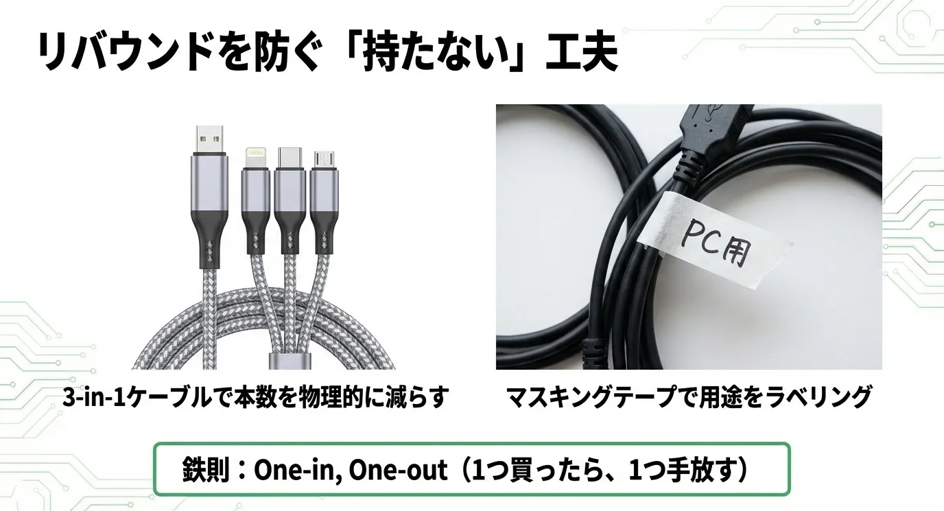 | 1本で多役 | 3-in-1ケーブルの活用 | 本数を物理的に削減 |