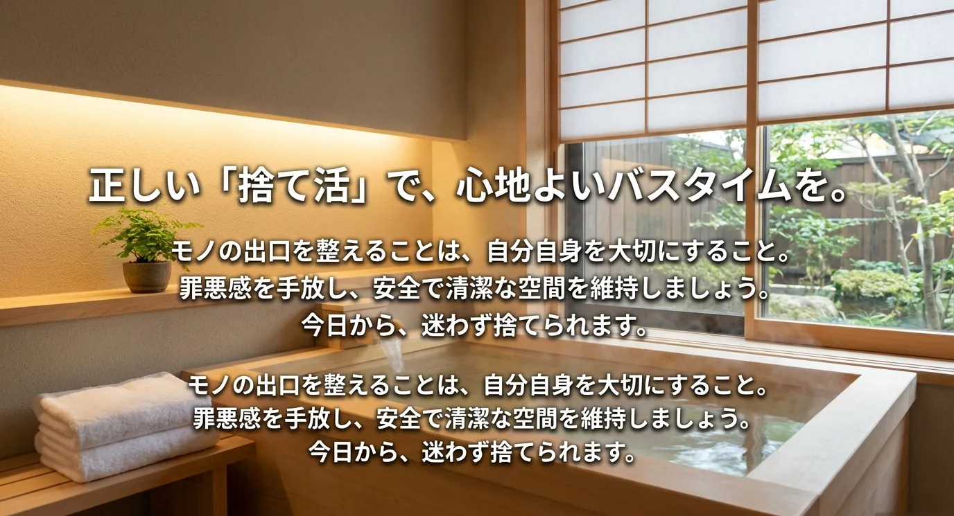 「捨てる」という行為を通じて自分の持ち物と対話することは、今の自分を見つめ直す貴重な機会になります。あなたが作り上げた清潔で整った浴室は、明日への活力を養う最高のパワースポットになるはずです。