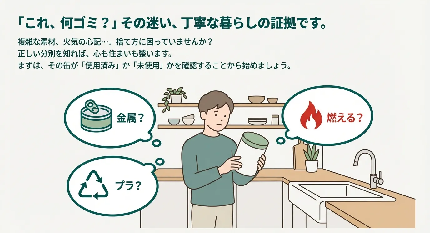 最も迷いやすいのが、直接煙を発生させた後の「金属缶(内釜)」の扱いです。多くの自治体では、この缶は「不燃ゴミ」や「小物金属」として扱われますが、中には「資源ゴミ(缶)」として回収している地域もあります。