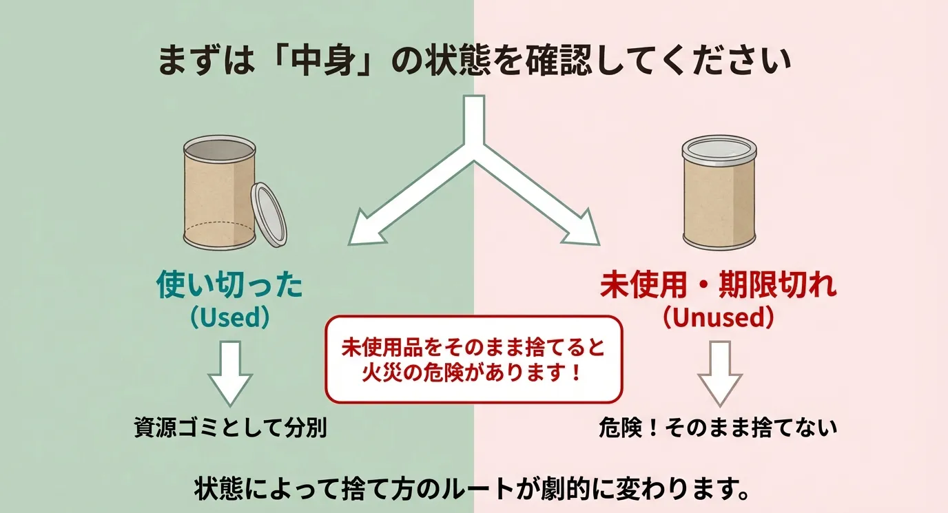 「使い終わった空き缶は放置せず、この専用ボックスに入れておいてね」「未使用品を見つけたら、危険だから勝手に捨てずに声をかけて」といったシンプルな決め事を作るだけで、家庭内のコミュニケーションがスムーズになります。