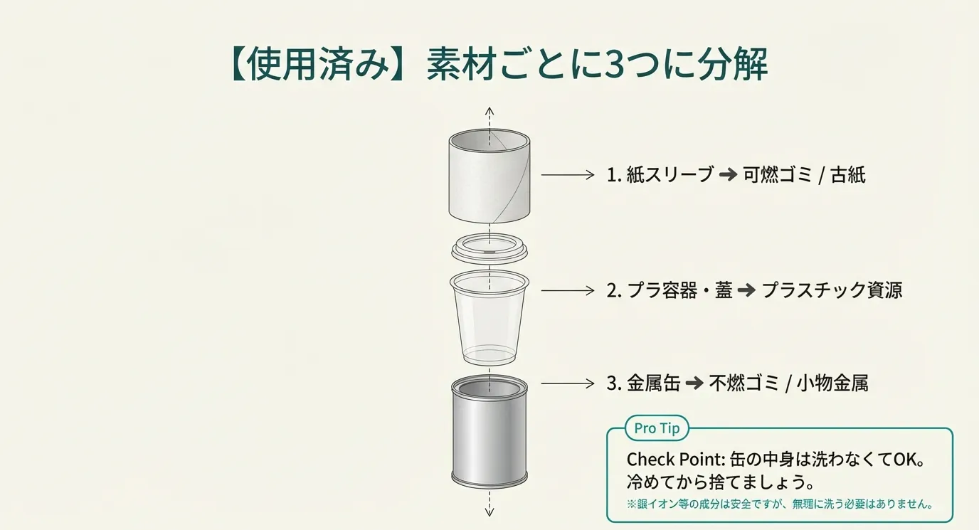 ここで大切なのは、缶の中に残っている薬剤のカス(銀イオンなどの残渣)を無理に洗い流そうとしないことです。使用済みの缶は非常に高温になっている場合があるため、完全に冷めたことを確認してから作業を行ってください。