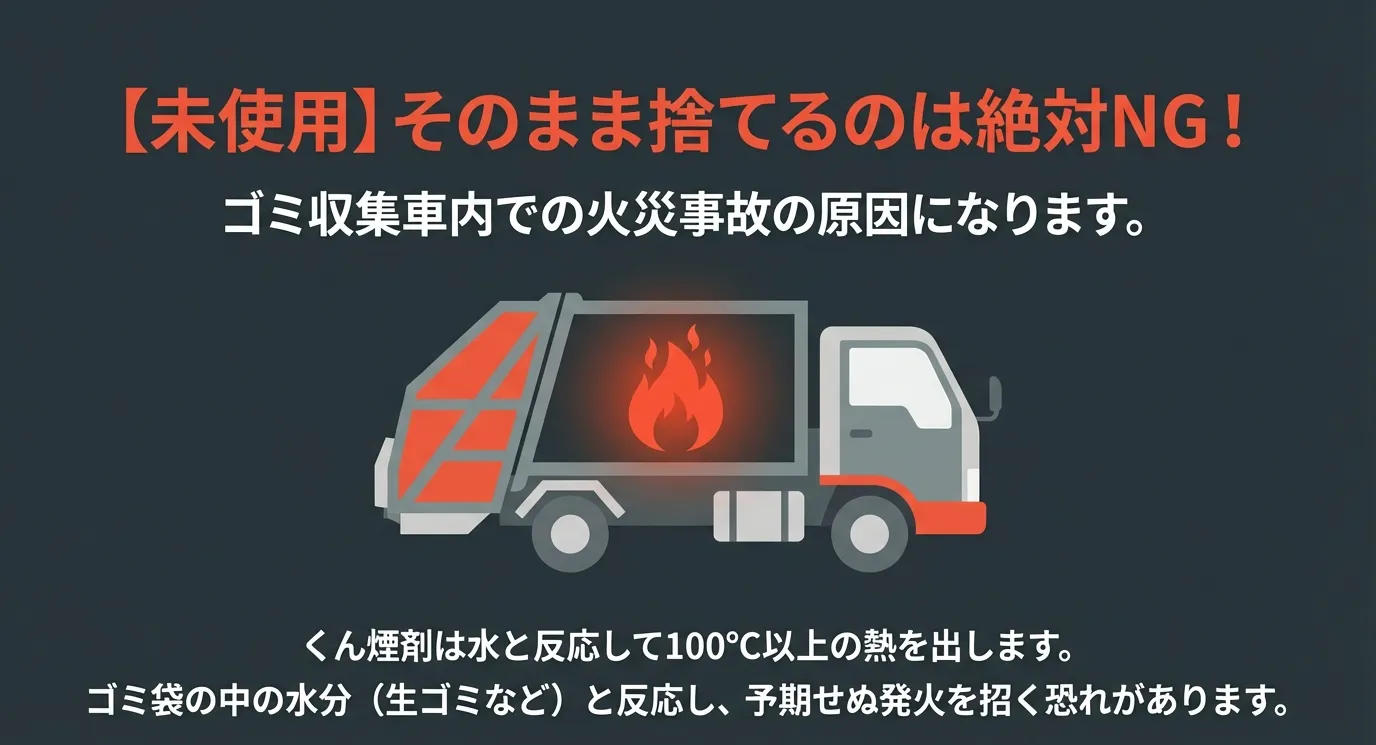 大掃除の際などに、棚の奥から期限の切れた未使用の防カビくん煙剤が出てくることがあります。これをそのままゴミ箱に捨てるのは非常に危険です。未使用の製品には、水と反応して激しく発熱・発煙する薬剤が充填されているため、ゴミ収集車の中で他のゴミに含まれる水分と反応し、火災や事故の原因になる恐れがあるからです。