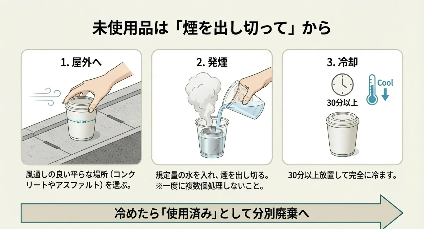 - 未使用品は必ず水に反応させて煙を出し切ってから処分する