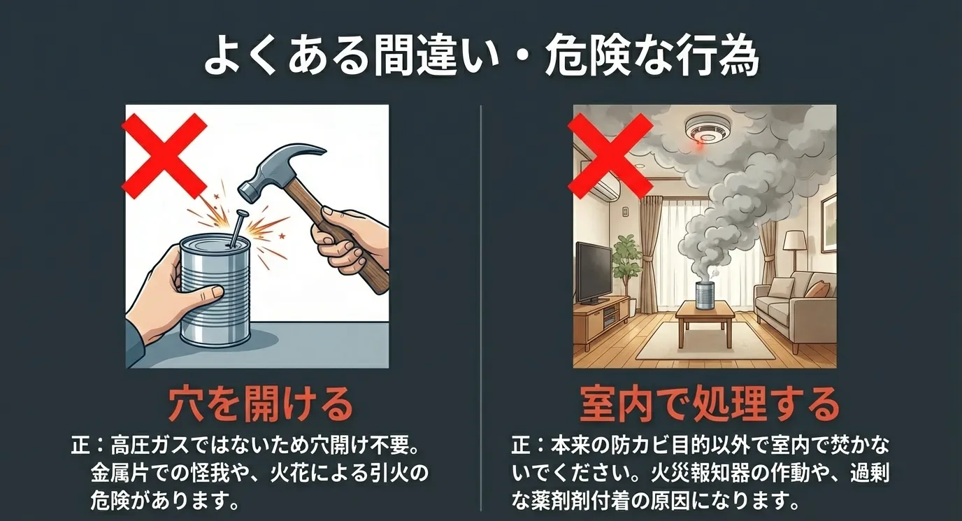 防カビくん煙剤の廃棄において、最も多い勘違いの一つが「カセットボンベのように穴を開けなければならない」という思い込みです。ガスを使用したスプレー缶やカセットボンベの場合は、爆発防止のために穴開けを推奨する自治体も一部にありますが、防カビくん煙剤の缶は高圧ガスを使用していません。そのため、無理に釘などで穴を開ける必要はなく、むしろ金属を貫通させる際に火花が散って内部の薬剤に引火したり、鋭利な断面で怪我をしたりする危険性があるため、穴開けは絶対に行わないでください。