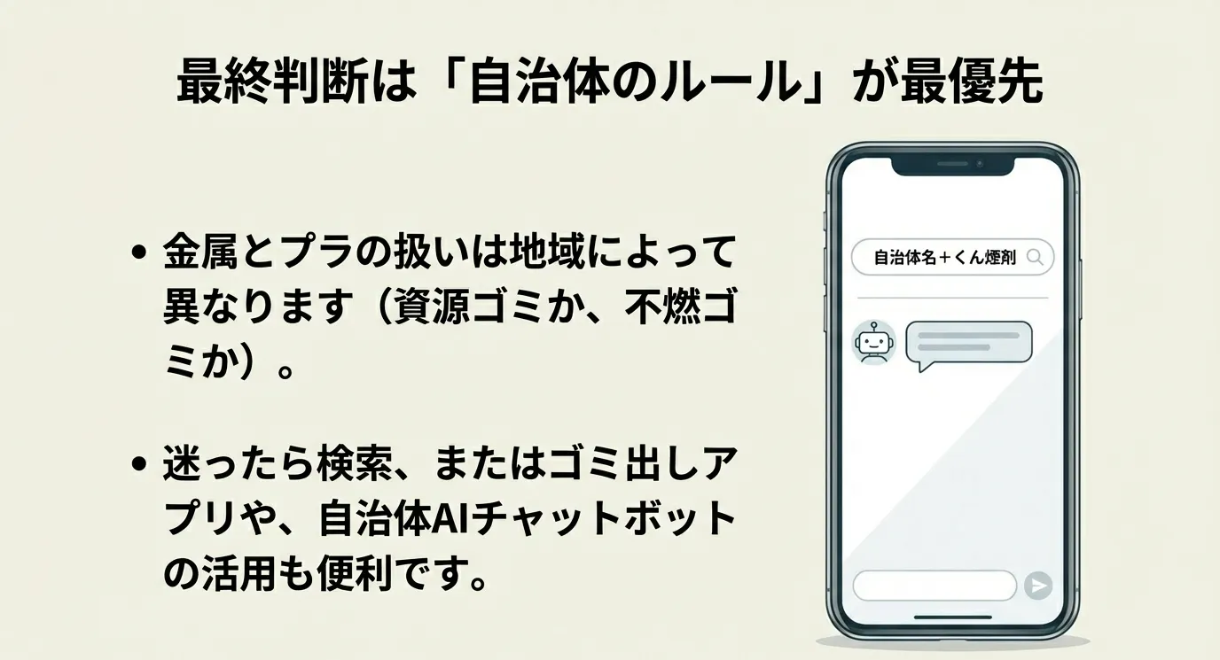 ゴミの分別ルールは、全国一律ではなく、お住まいの市区町村によって大きく異なります。防カビくん煙剤のような、プラスチックと金属が組み合わさった製品は、自治体によって「不燃ゴミ」であったり「資源ゴミ」であったりと判断が分かれることが多いのが現状です。