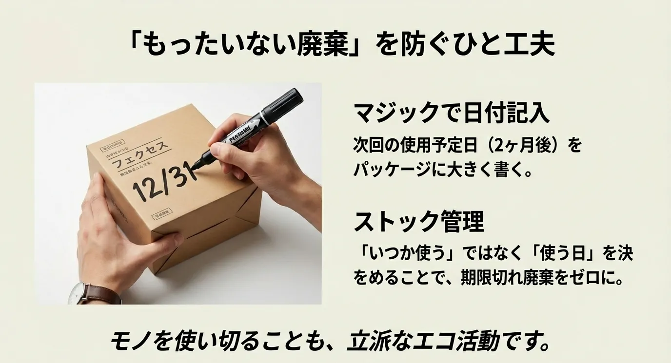 - ストック管理のコツは、パッケージに次回の使用予定日(2ヶ月後)をマジックで直接記入することである