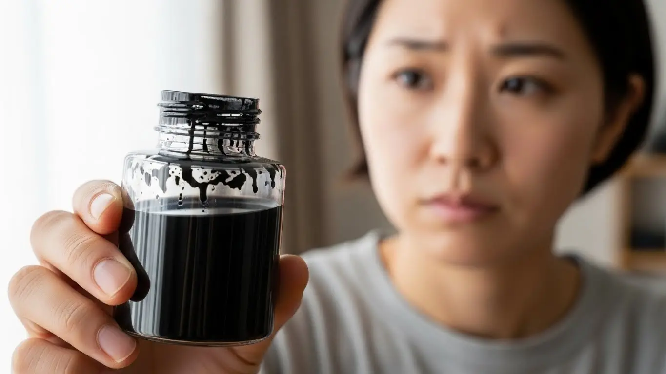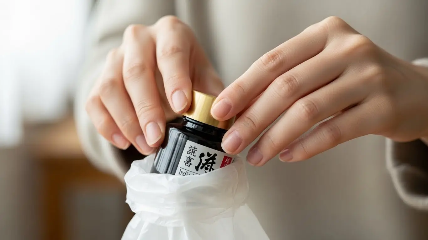 収納の奥から何年も前の墨汁が出てきた場合、水分の蒸発により容器の中でカチコチに固まっているケースがよくあります。すでに固形化している墨汁は、改めて溶かす必要は一切ありません。無理に水やお湯を入れて溶かそうとすると、かえって飛び散りの原因になったり、排水溝を汚すリスクを再発生させたりするだけです。固まった墨汁は、そのまま「可燃ゴミ」として扱うことができます。