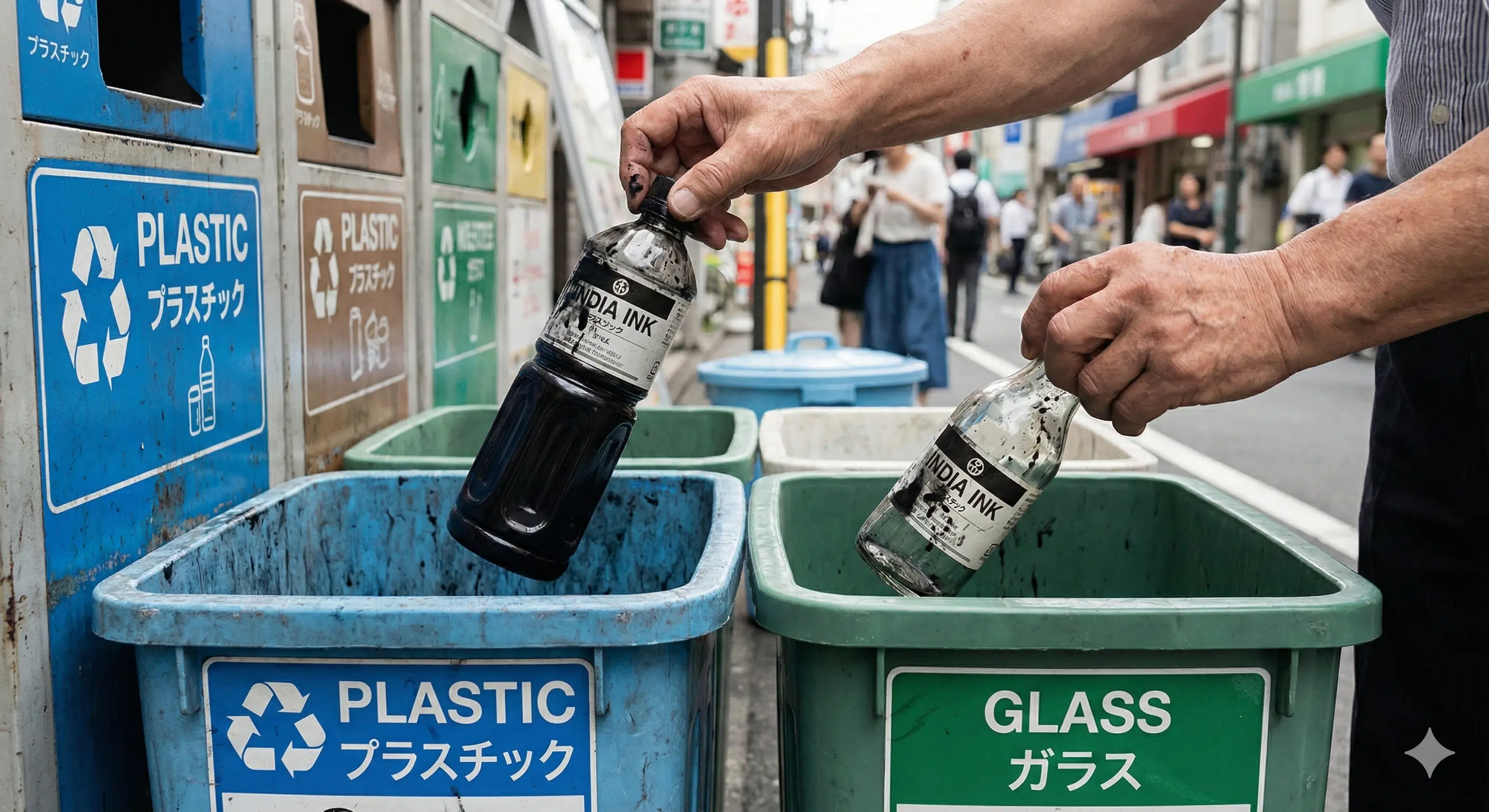 墨汁の処分において、「容器の中がどうしても洗えない」という悩みは避けて通れません。結論から申し上げますと、墨汁の容器に関しては「無理に洗ってリサイクルに出す必要はない」と割り切ることが大切です。