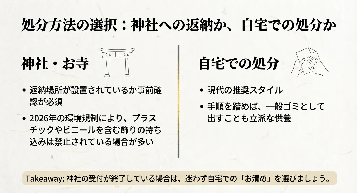どんど焼きを逃してしまった場合、まず検討すべきなのは「神社の古神札納所への持参」です。