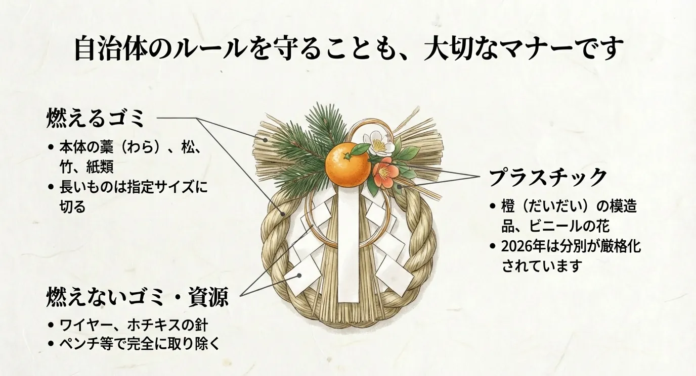 自宅で清めた正月飾りをゴミとして出す場合、最も重要なのが各自治体の分別ルールを遵守することです。2026年現在、多くの地域ではゴミの減量と資源化が厳格に進んでおり、正月飾りも「ただの燃えるゴミ」として出すことができないケースが増えています。