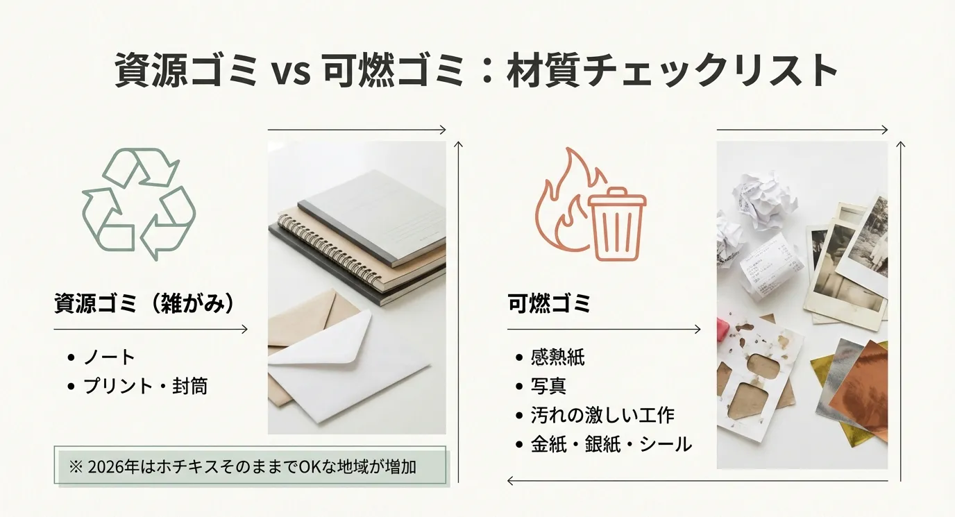 これらは基本的に可燃ゴミとして扱うことになります。捨てる前に、その紙が「もう一度紙に生まれ変われるか」という視点を持つことが、環境に配慮した断捨離の第一歩となります。