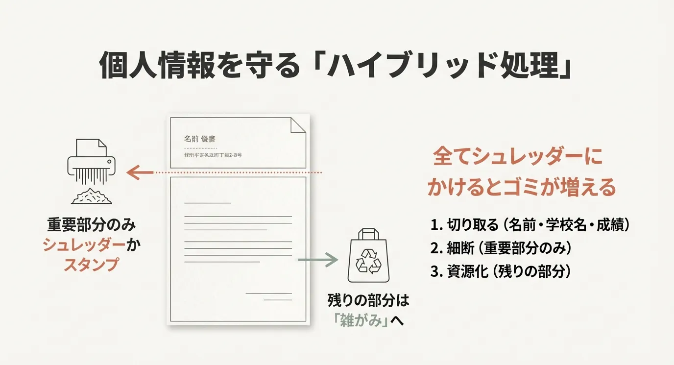 また、物理的に「読めなくする」方法として、ハサミでの細断や、水に浸して判読不能にする方法もありますが、大量のプリントを処理するには時間がかかりすぎます。そこで、効率を重視するなら、重要箇所だけを切り取って細断し、残りの白紙部分は資源ゴミに回すという使い分けがおすすめです。