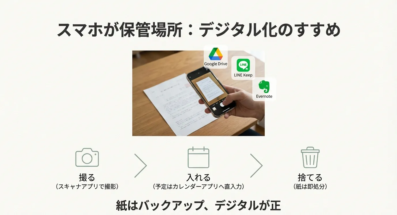 2026年現在、学校プリントの整理において最も推奨されるのがデジタル化です。スマートフォン一台あれば、部屋のスペースを一切使わずに、数年分のプリントを管理することが可能です。