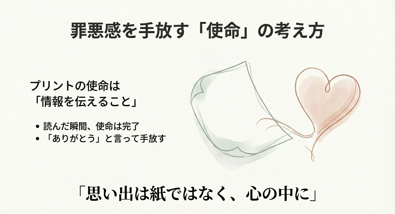 学校のプリントを捨てる際、多くの方が「子供の成長の証を捨てるようで申し訳ない」「先生が一生懸命作ってくれたのに」という罪悪感を抱きがちです。しかし、断捨離の本質は「今」を大切に生きることにあります。