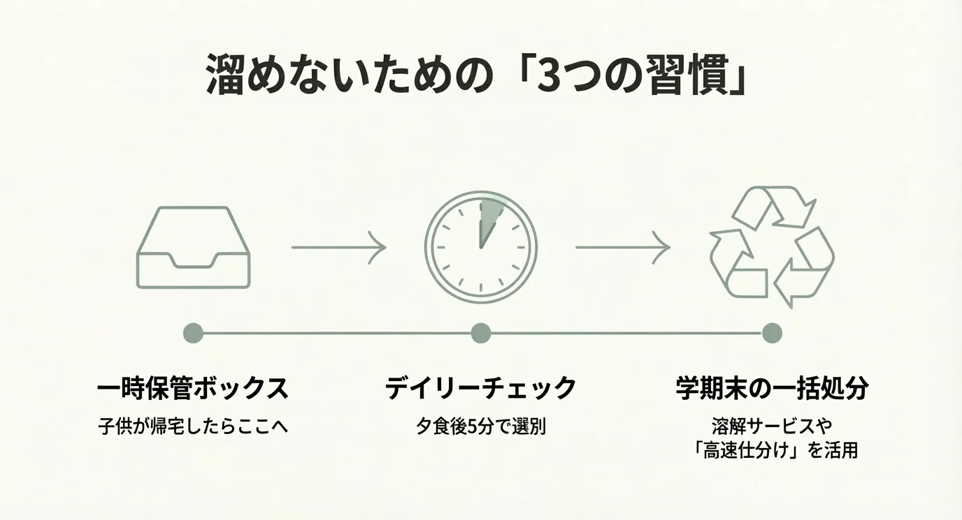 まずは「デイリー・チェック」です。これは毎日、子供が寝た後や夕食後の5分間で行います。その日に配られたプリントの内容を確認し、不要なチラシや集金が終わった案内はその日のうちにゴミ箱へ捨てます。