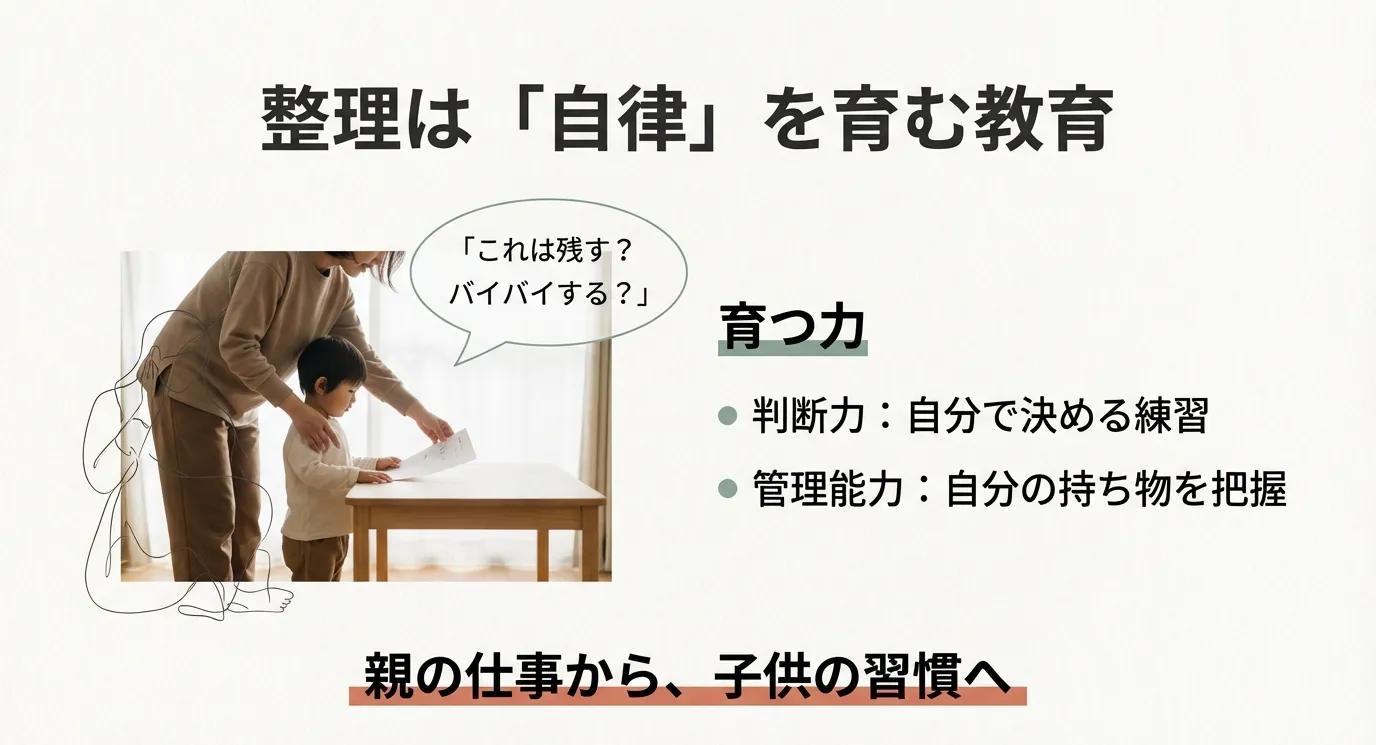 - 子供と一緒に整理を行うことは自律性や判断力を養う教育機会になる