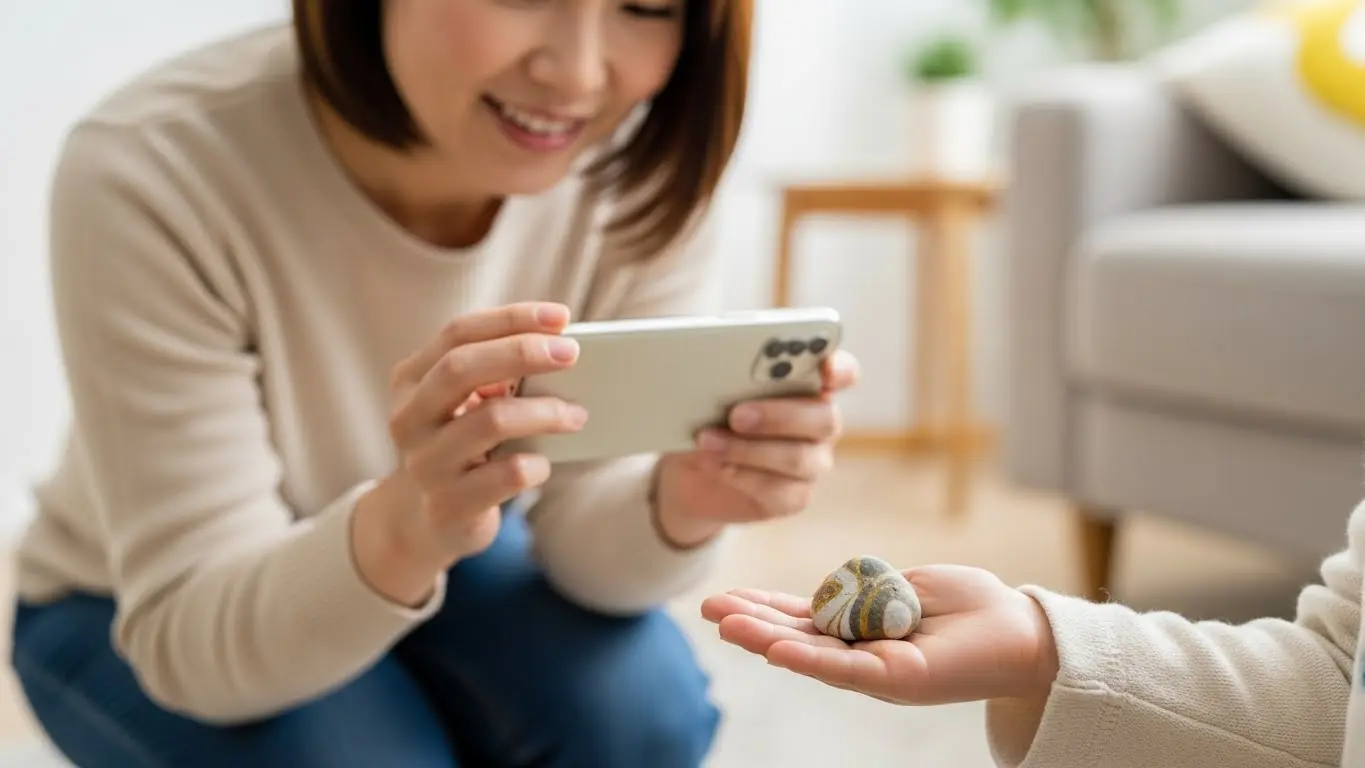 具体的には、スマートフォンのカメラを使って石を撮影し、デジタルデータとして保存することをおすすめします。ただ石を撮るだけでなく、その時のエピソードをメモ書きにして添えて撮影したり、子供がその石を手に持っている姿を動画で残したりすると、より鮮明に記憶を留めておくことができます。