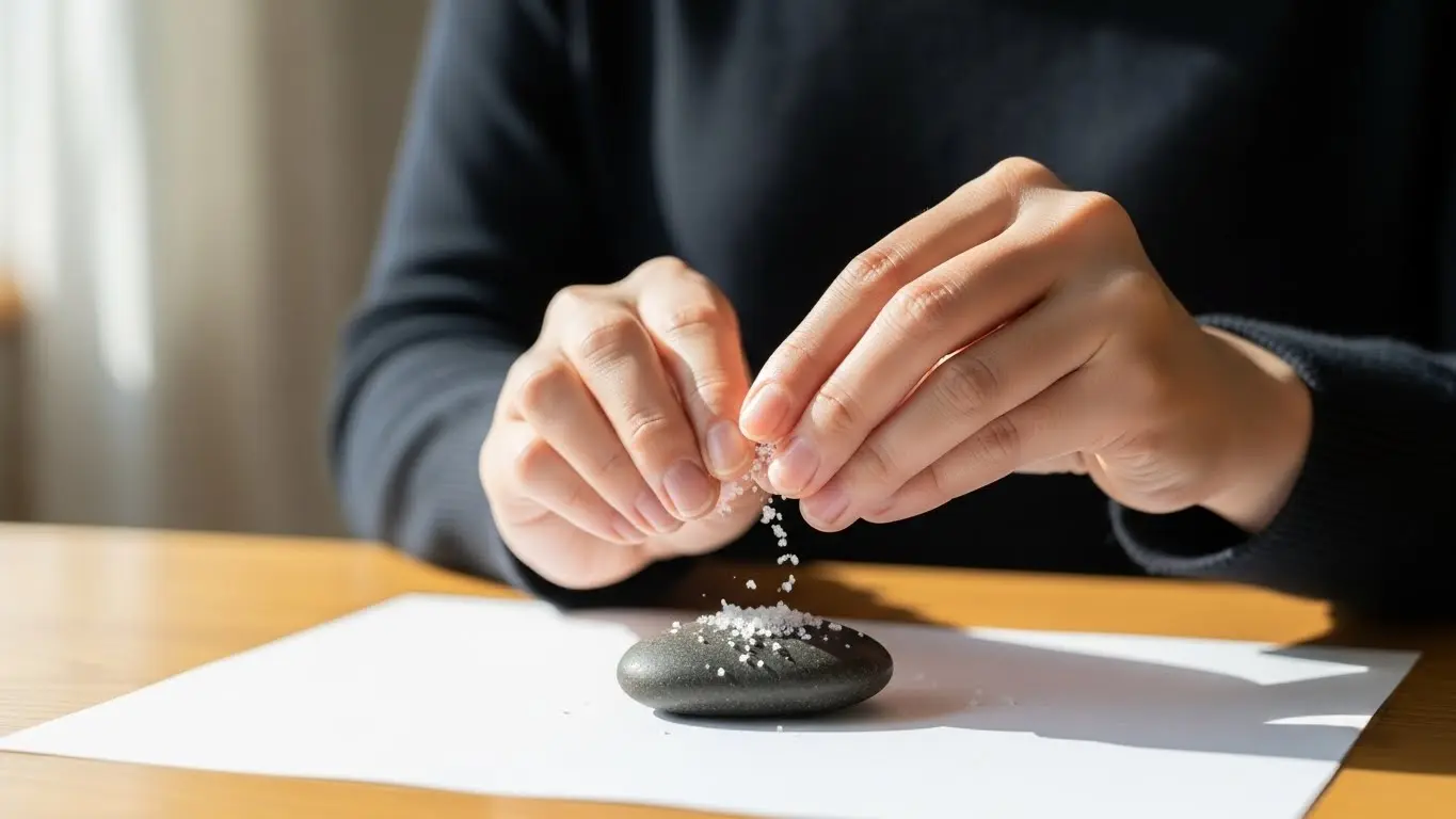 - 塩と紙を用意する: キッチンにある普通の粗塩(精製塩でも可ですが、天然塩がより好ましいとされます)と、白い紙(半紙、コピー用紙、キッチンペーパーなど)を用意します。