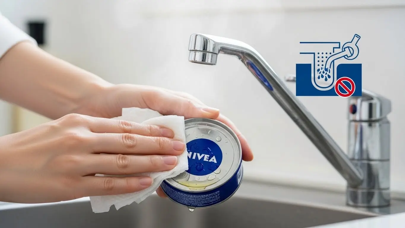 先ほどもお伝えした通り、ニベアクリームの油分は冷たい水では固まってしまい、石鹸を使ってもなかなか落ちません。また、大量の油分を排水溝に流すことは、家庭内の配管に油脂が蓄積して詰まりを引き起こすリスクがあるだけでなく、下水処理施設への負担や河川の水質汚染にもつながります。