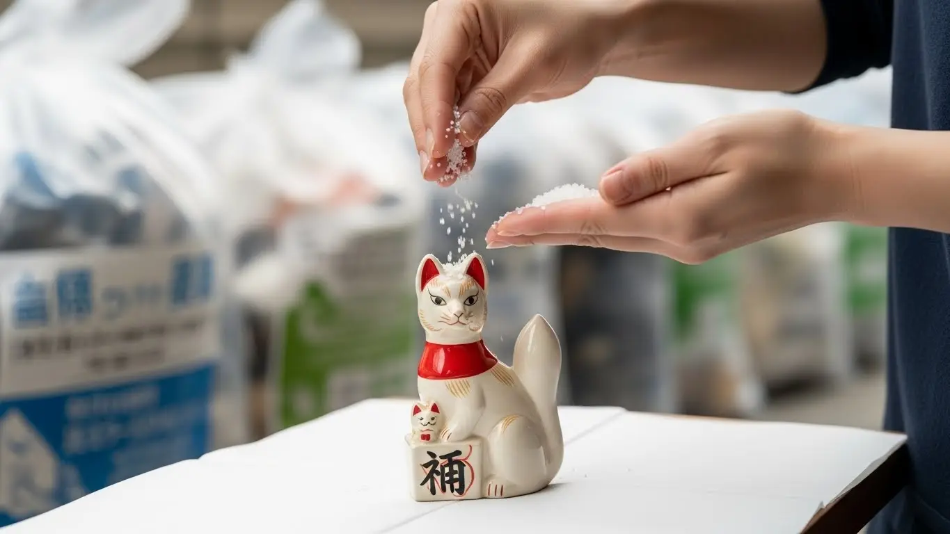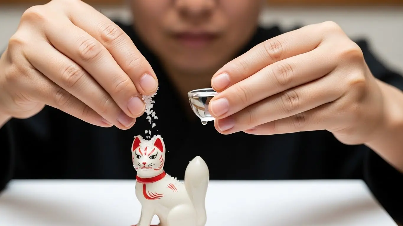 具体的な手順としては、まず狐の置物をきれいに拭き清め、白い紙(半紙やコピー用紙など)の上に置きます。そして、粗塩を「左・右・左」とかけ、その後に清酒を少量かけます。