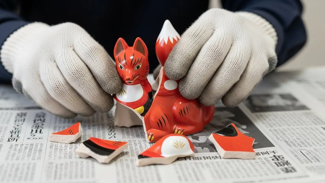 しかし、物理的な危険性には十分な注意が必要です。陶器製の狐の破片はナイフのように鋭利で、回収作業員や家族が手を切る怪我をする恐れがあります。割れてしまった場合は、以下の手順で安全に処理してください。