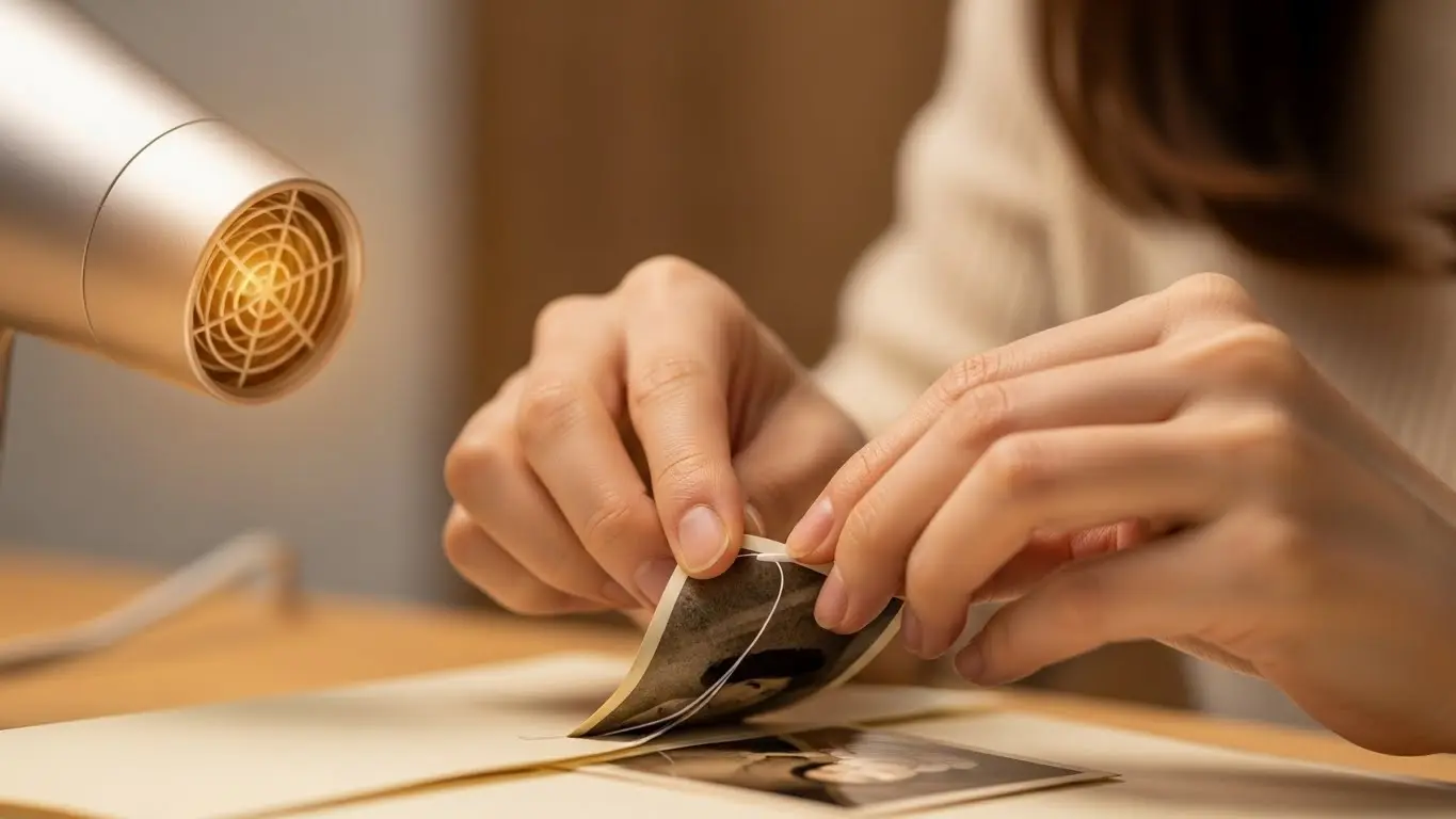 まず、最も有効なのが「ドライヤー」を使う方法です。写真と台紙の隙間に温風を当てながら、糊を少しずつ温めて柔らかくします。糊は熱に弱いため、温めることで一時的に粘着力が弱まり、剥がしやすくなります。ただし、あまり高温にしすぎたり長時間当て続けたりすると、写真自体が変色したり丸まったりする恐れがあるため、20cmほど離して様子を見ながら慎重に行ってください。