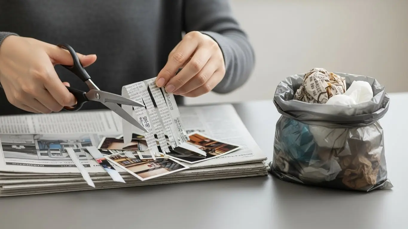 さらに心理的な安心感を得るための「迷彩工作」も重要です。裁断した写真は、新聞紙や厚手の紙袋に包んでから指定のゴミ袋に入れます。この時、生ゴミやコーヒーの出し殻など、他の生活ゴミと混ぜてしまうのも効果的なテクニックです。汚れたゴミと混ざることで、万が一袋が破れても、誰も中身を詳しく見ようとは思いませんし、写真を拾おうという気も起こさせません。