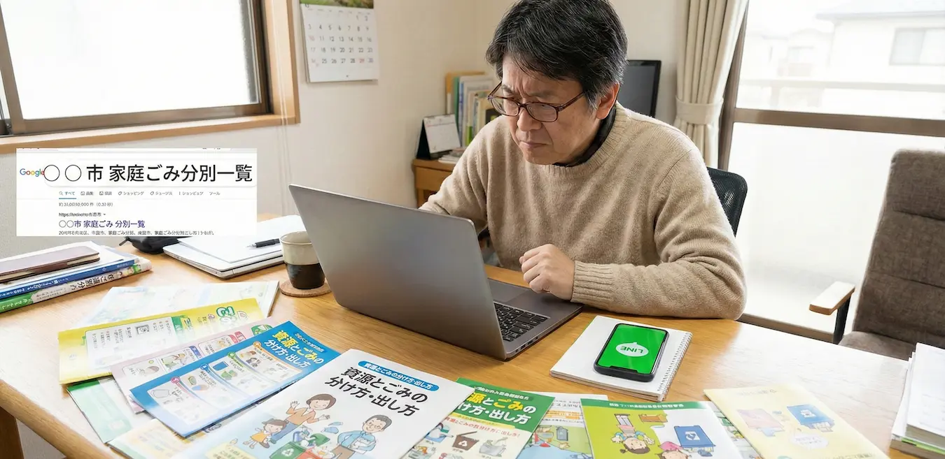 1. Web検索: 「〇〇市 家庭ごみ 分別一覧」で検索し、50音順リストを見る。