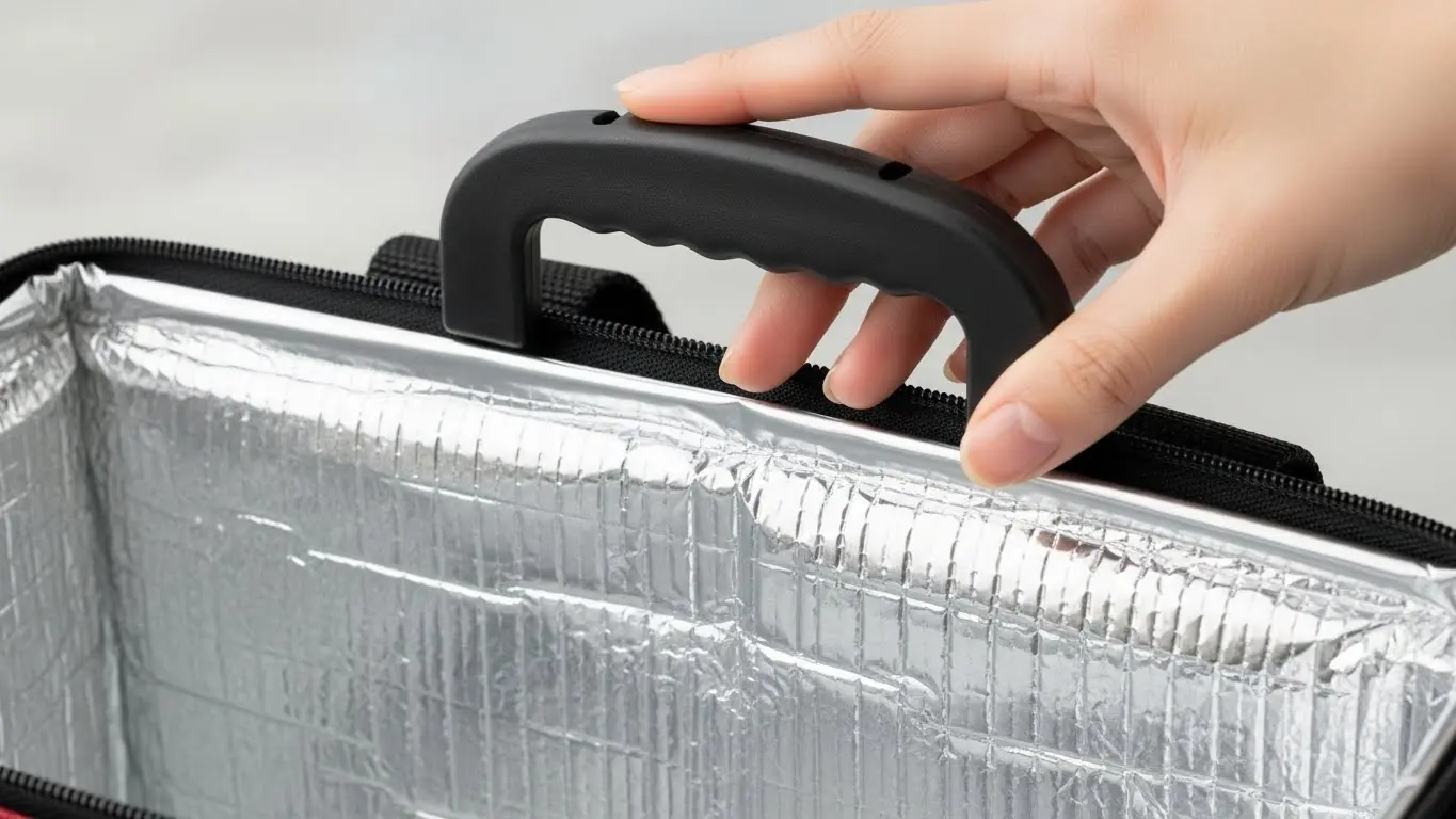 保冷バッグの構造は一見シンプルに見えますが、実は複数の素材が組み合わさってできています。特に分別に迷うのが、内側のキラキラした「アルミ蒸着フィルム」と、丈夫な「持ち手(ハンドル)」の部分です。