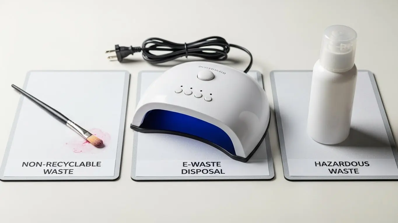 ジェルネイル本体だけでなく、施術に使っていた筆(ブラシ)、硬化用ライト、クリーナー(溶剤)などの周辺グッズも、断捨離のタイミングで一緒に処分したいアイテムです。これらも素材や性質によって捨て方が異なるため、整理しておきましょう。