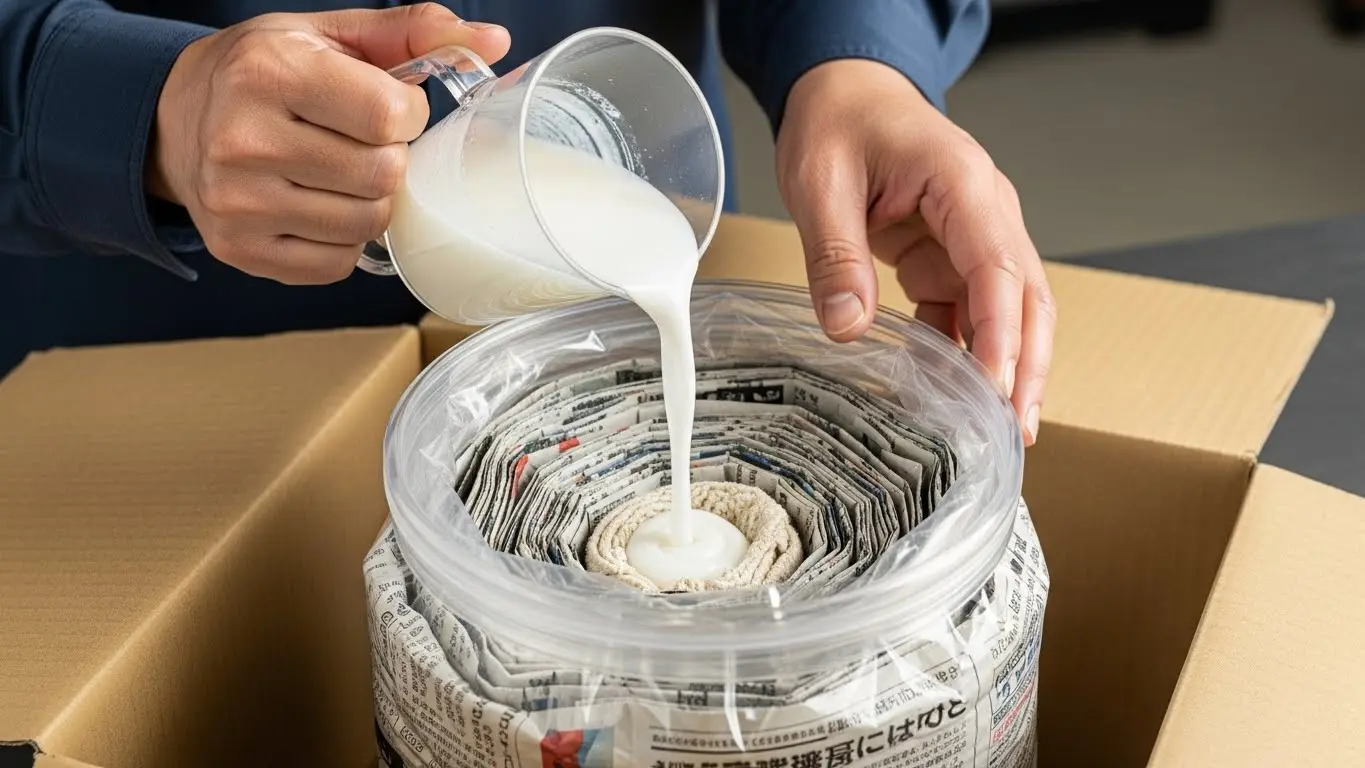 作業のポイントは、一気に入れすぎないことです。液体が紙や布全体に行き渡るのを確認しながら、少しずつ注いでください。もし液体が多すぎて吸い切れない場合は、さらに新聞紙を追加するか、高分子吸収体を使用しているペット用トイレシートやおむつ(サイズアウトした未使用のもの等)を活用するのも非常に効果的です。